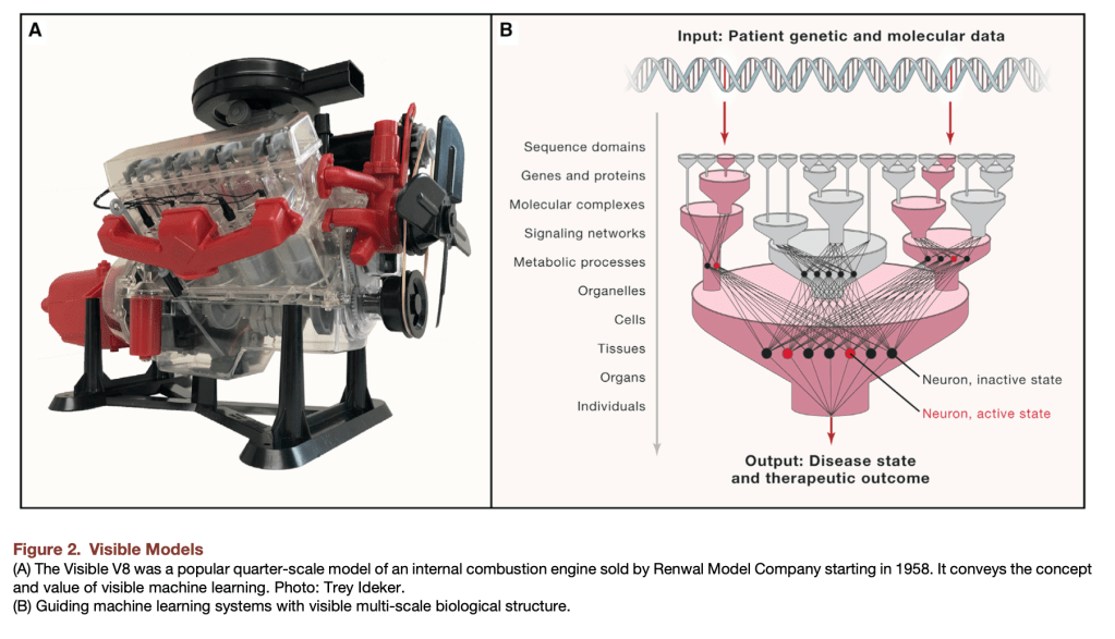 A compelling roadmap for ML in biology can be found in Yu and Ideker’s “Visible Machine Learning,” which makes use of the Visible V8, a toy engine, as its organizing principle. Just as mechanics need to understand how an engine works in order to repair it, so biologists need to understand how organisms work in order to understand biology and cure diseases. The Visible V8 approximates a true engine closely enough that important lessons about real engines can be learned by studying it. Thus the authors propose that when ML is applied to biological data, the emphasis should be on developing visible (i.e. interpretable) ML models, because the biological insights will come primarily from the structure of the models themselves rather than the model outputs.